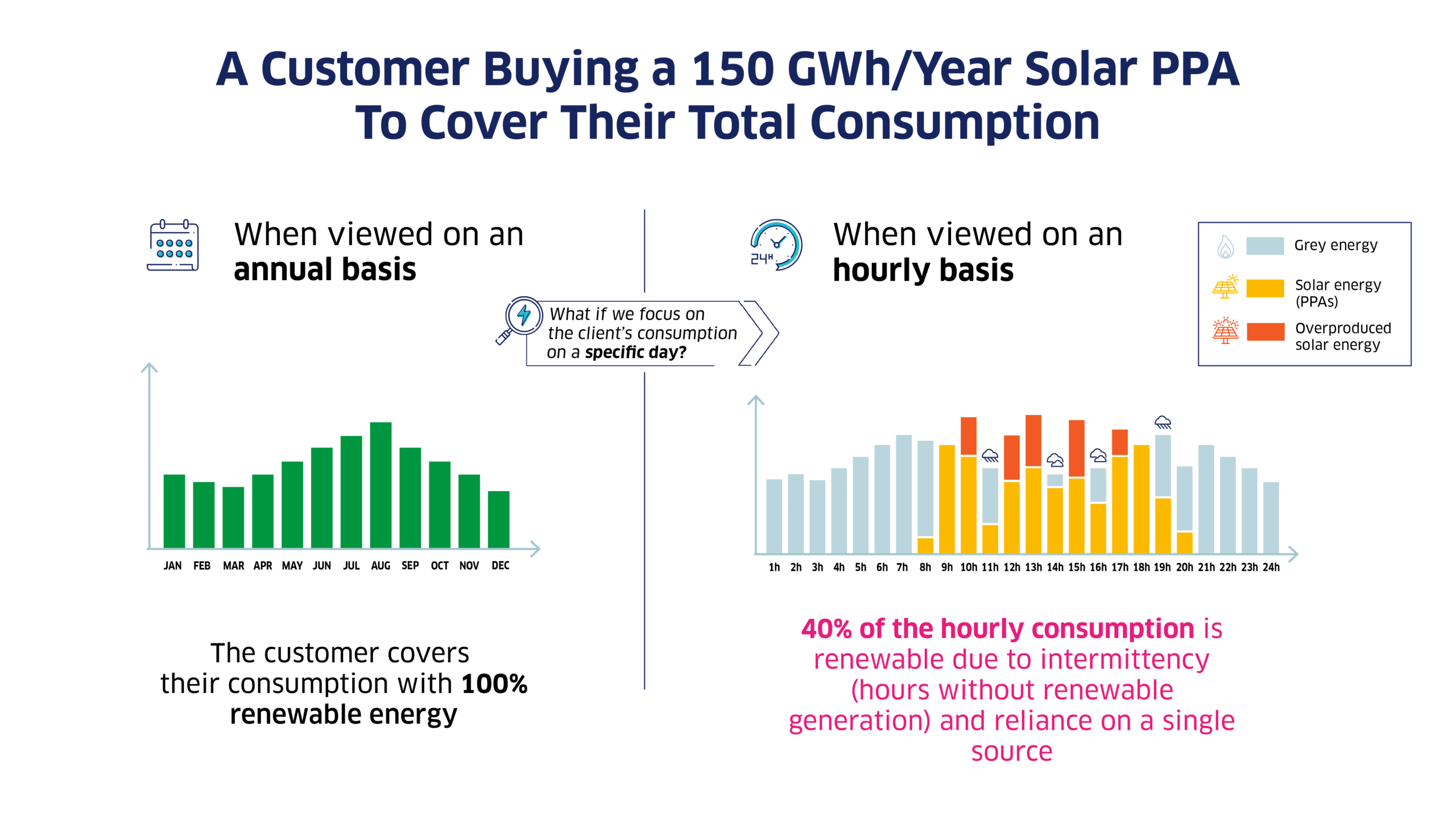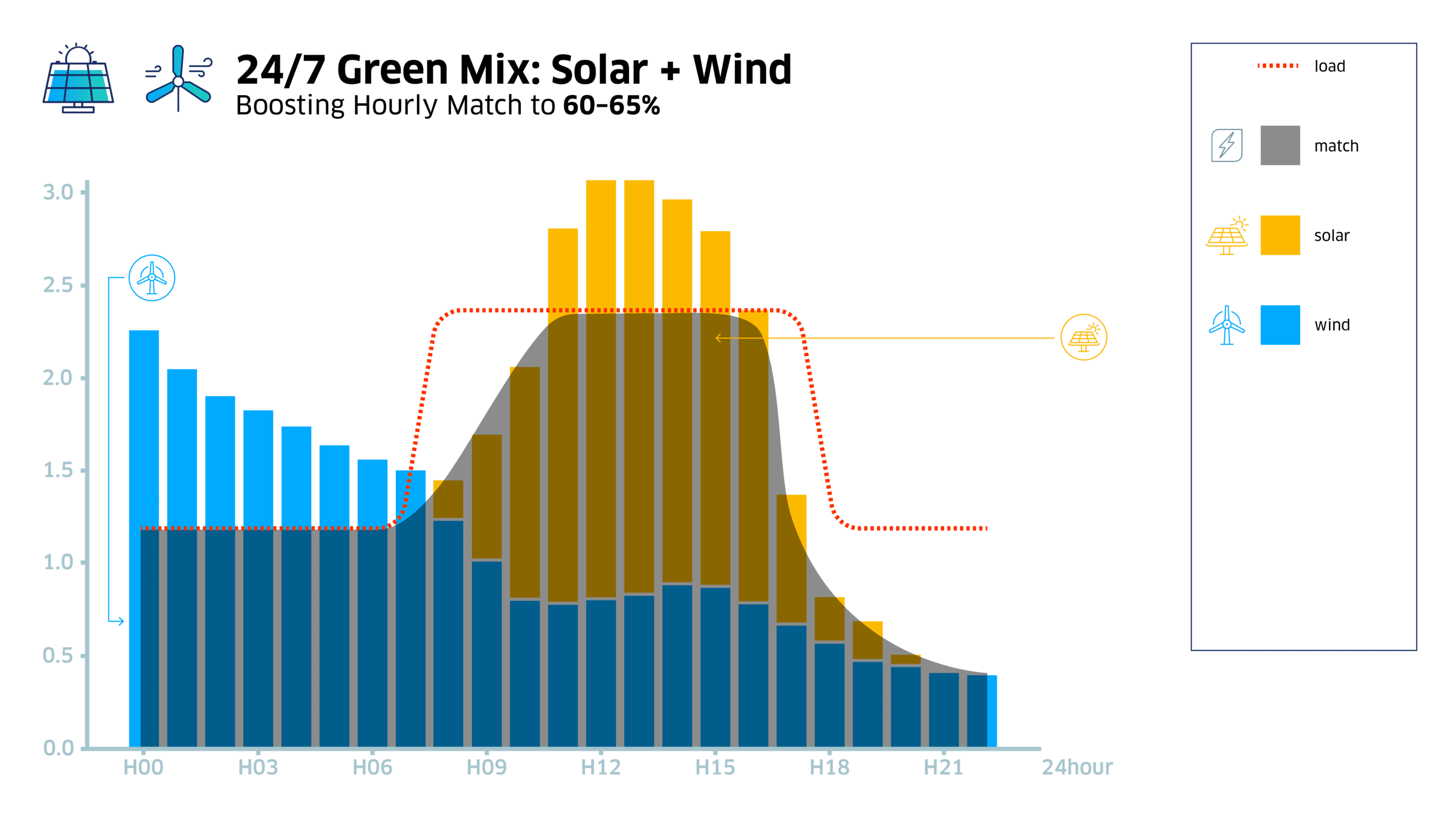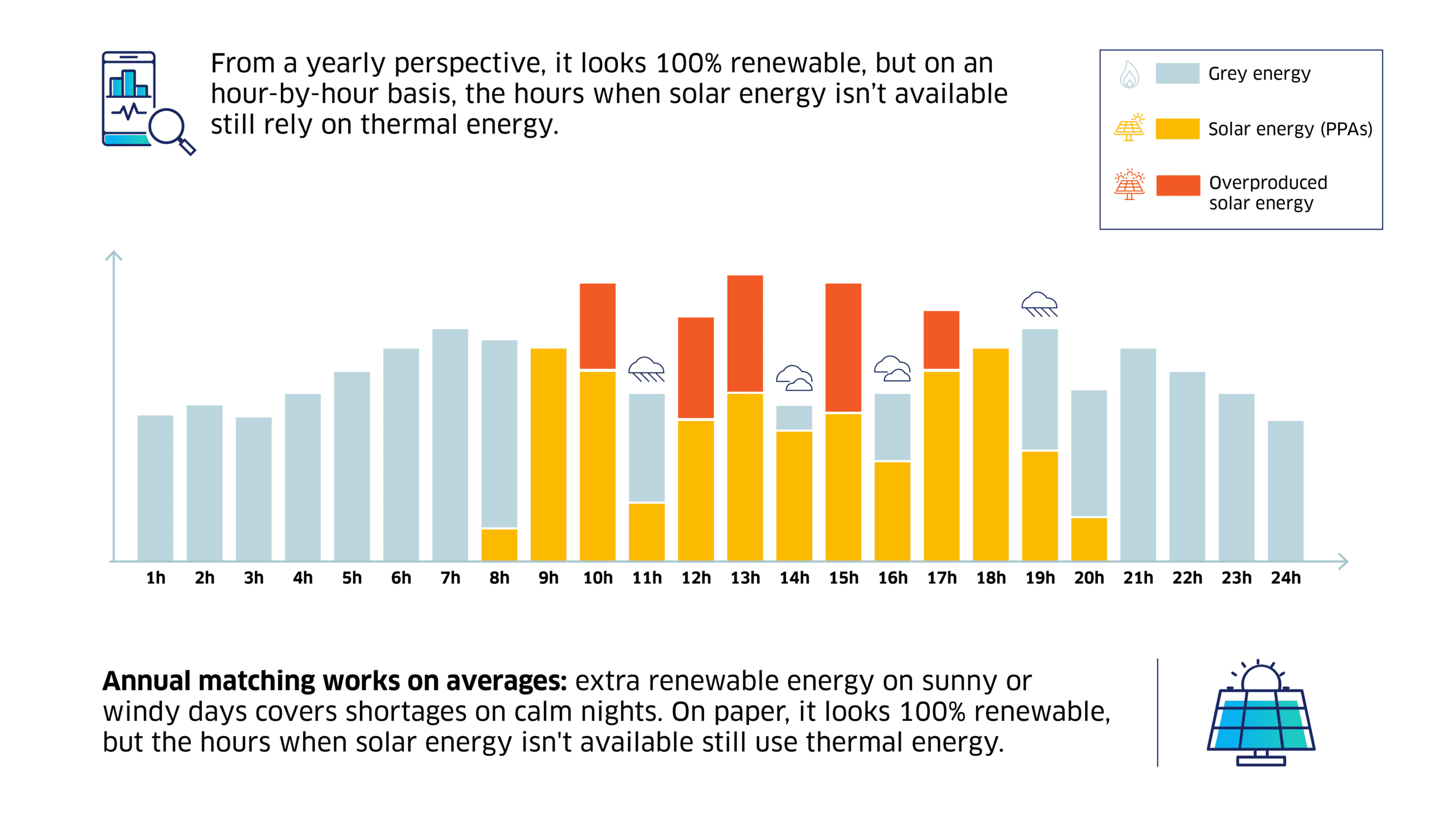 Renewable energy supply is intermittent—solar peaks at midday while wind may surge at night—while a company’s electricity demand follows its own curve. This mismatch creates gaps when clean power isn’t available, and surpluses when generation exceeds demand.